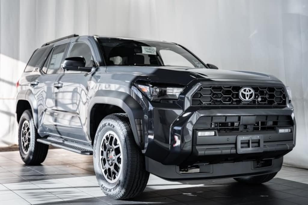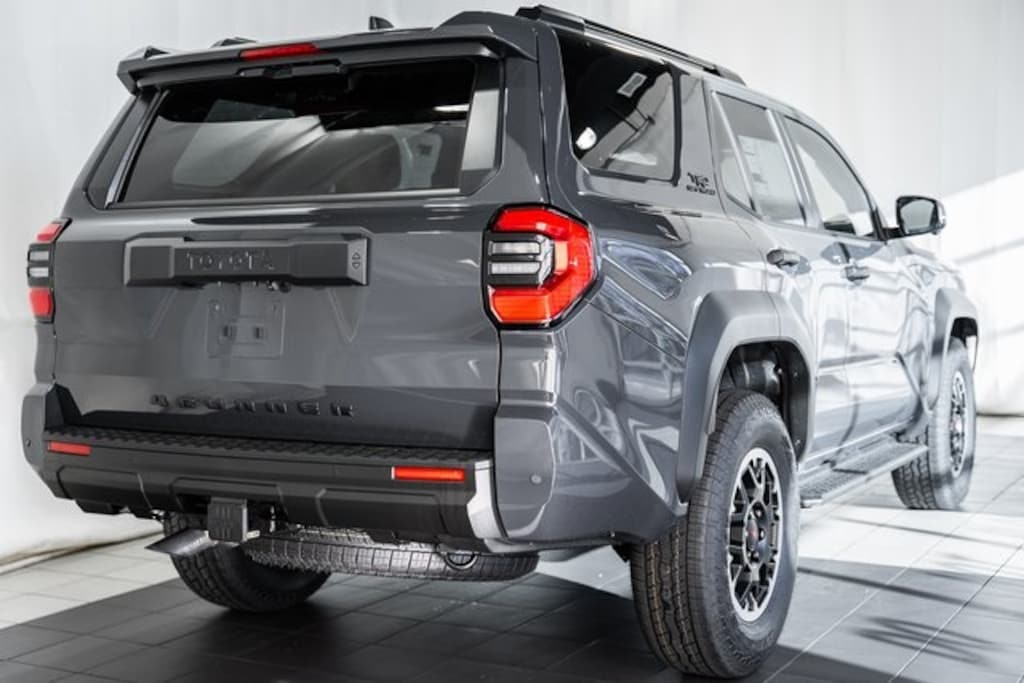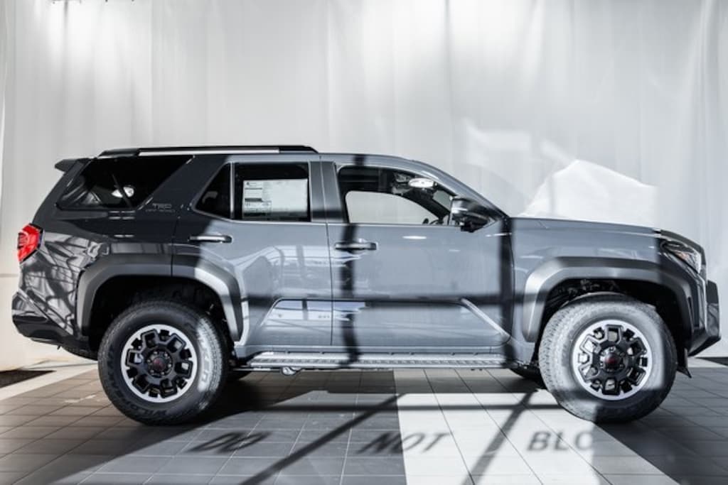 - Black honeycomb-style grille, mirror caps, door handles, and overfenders color-keyed rear spoiler black 'TRD OFF ROAD' and '4RUNNER' badges